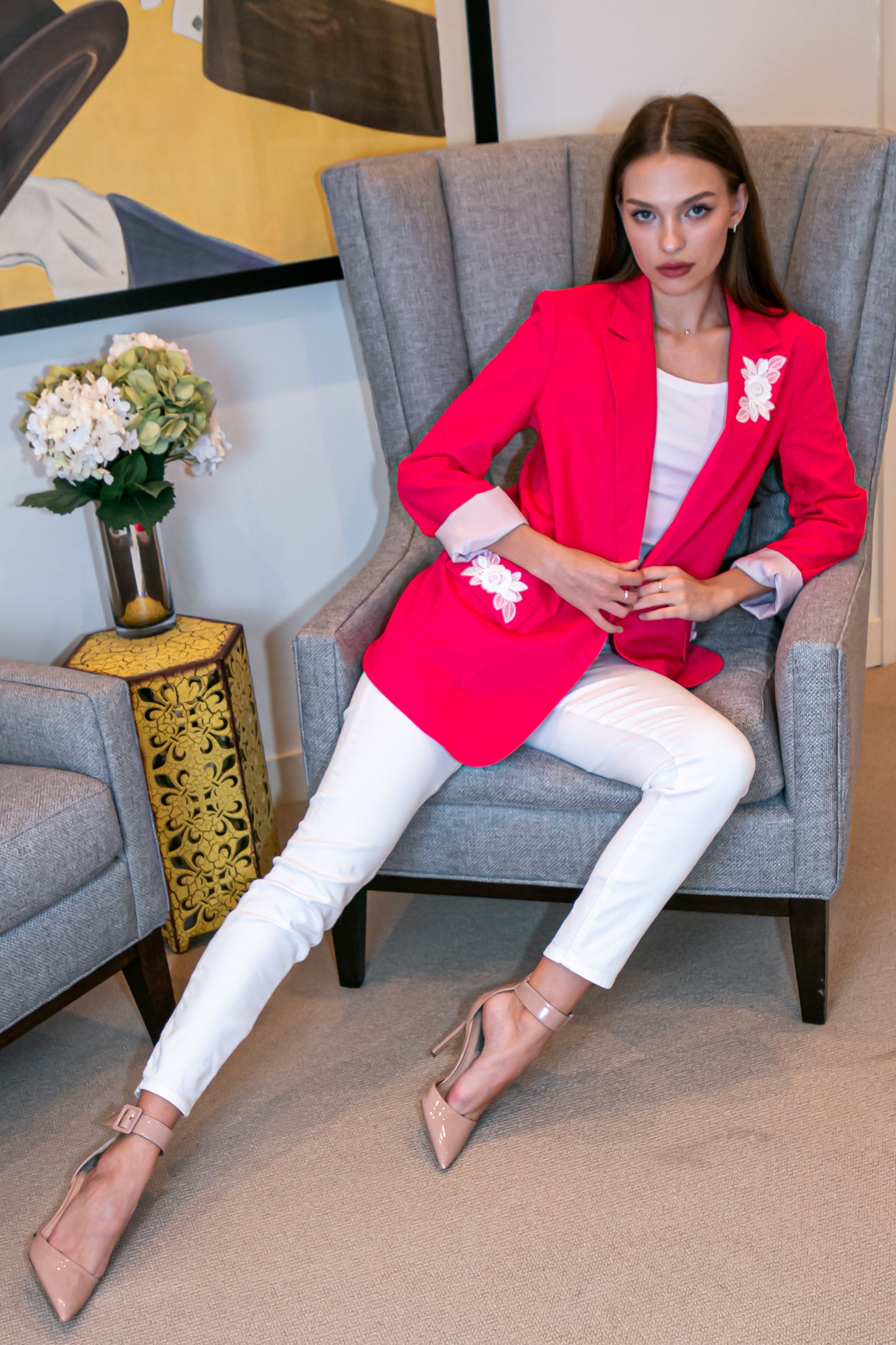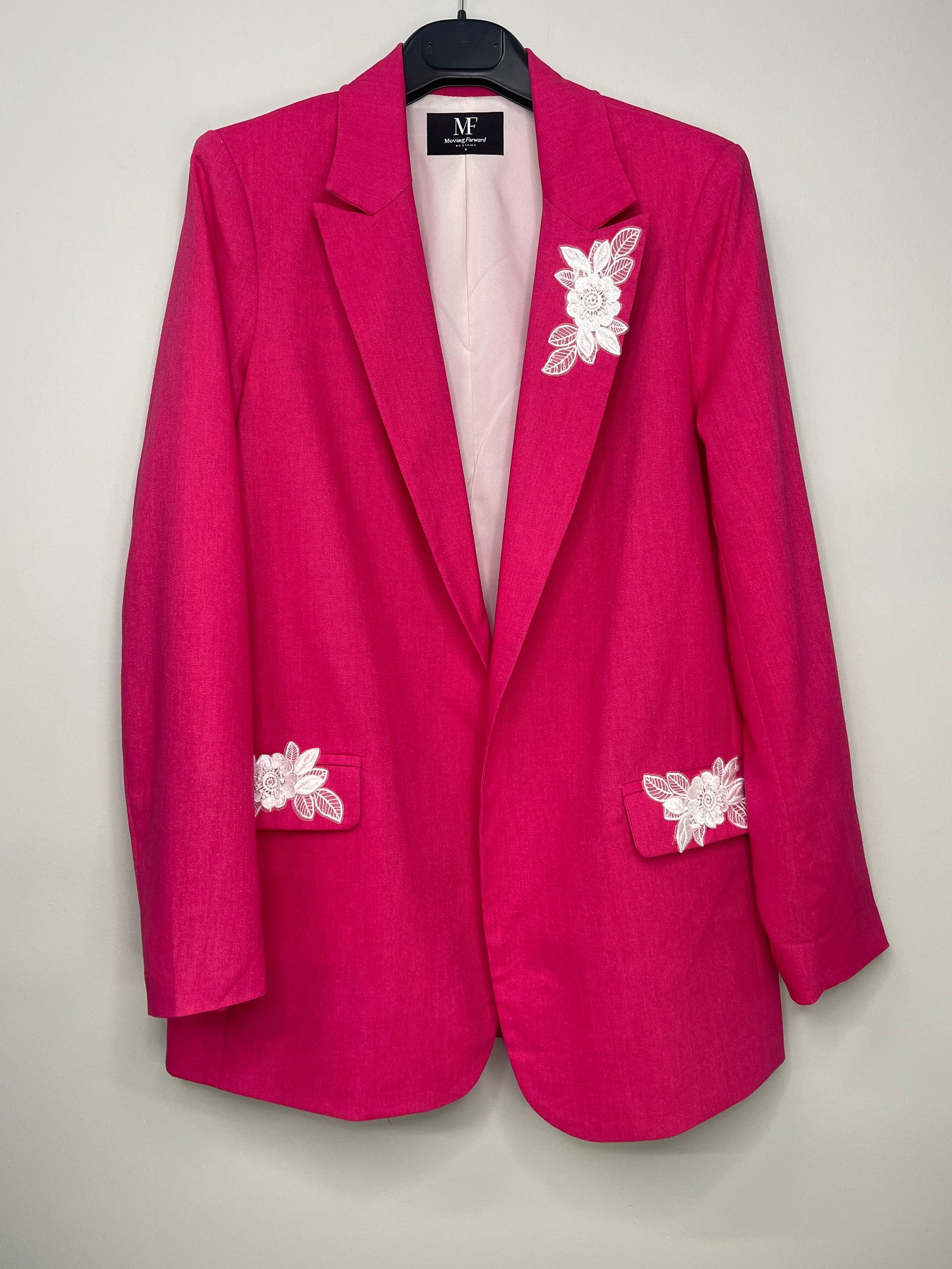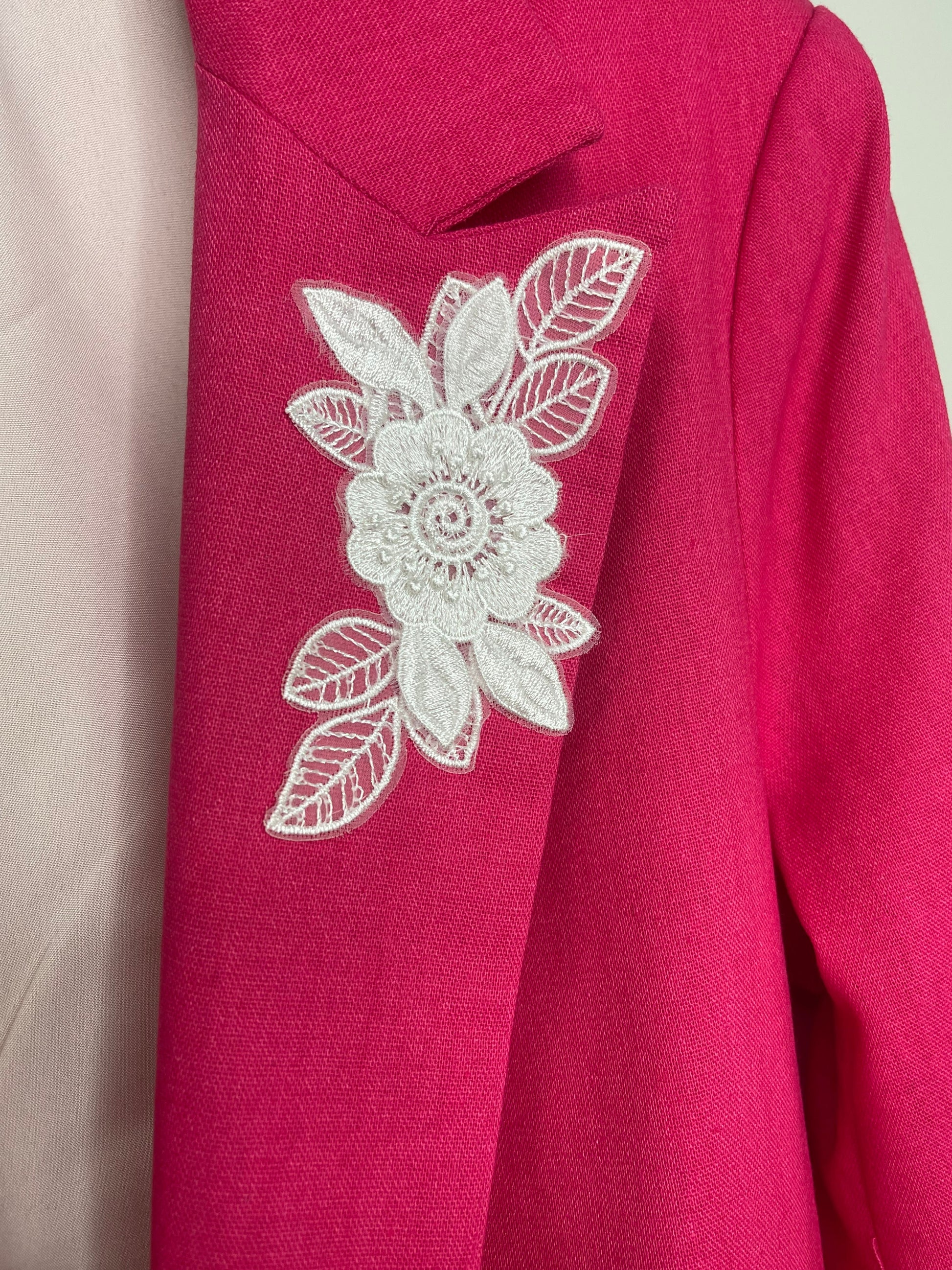 Introducing our pink linen blazer with delicate white lace flowers. Made with a high-quality linen blend, this blazer adds a touch of classic yet unique style to your wardrobe. Perfect for any occasion, this blazer combines comfort and fashion seamlessly. Upgrade your look today!