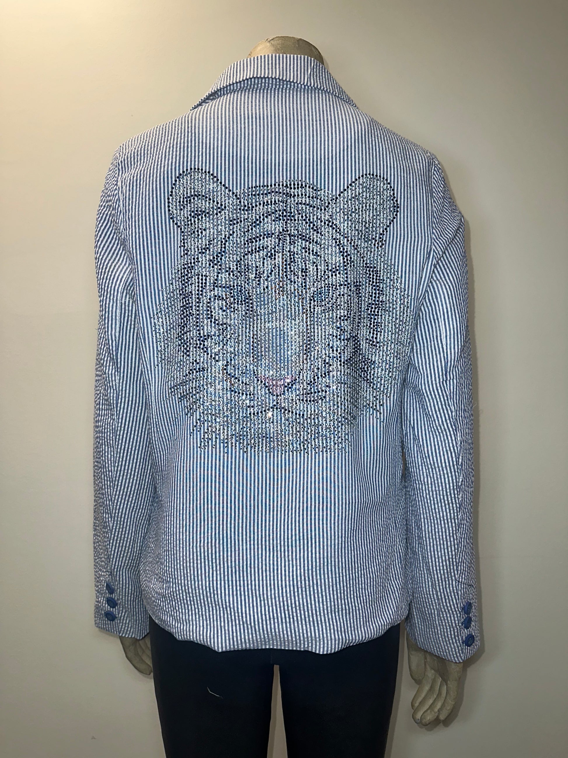 This blue seersucker blazer features our gorgeous crystal silver tiger face. Crafted from seersucker material, this blazer provides a lightweight and breathable fit, perfect for warmer weather. Its timeless design adds a touch of elegance to any outfit. Stay stylish and sophisticated with this unique piece.