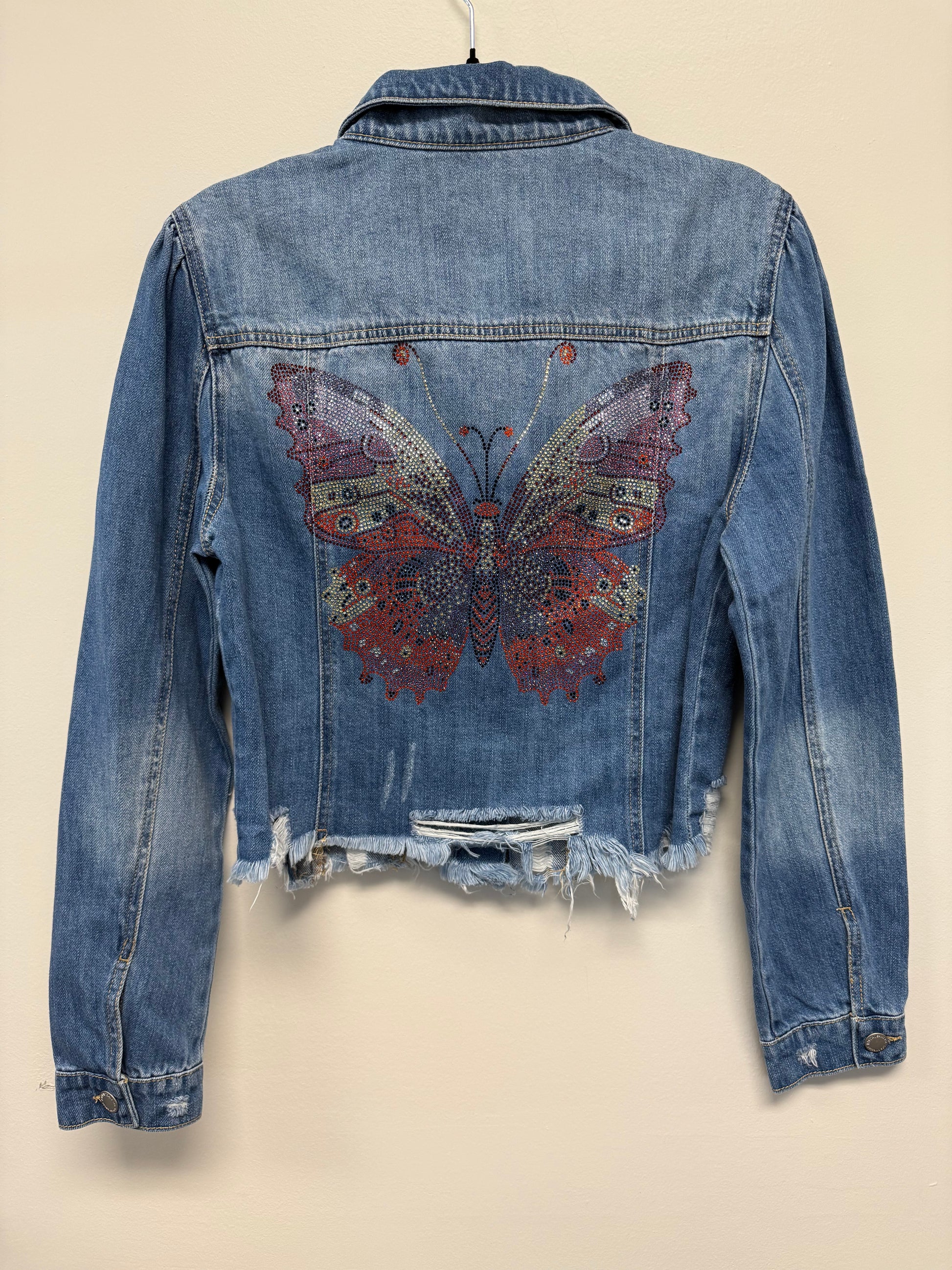 Complete your look in our raw hem denim jacket with butterfly. Crafted from a distressed blue denim, this jacket is perfect for any occasion. Add a touch of fun to any outfit!