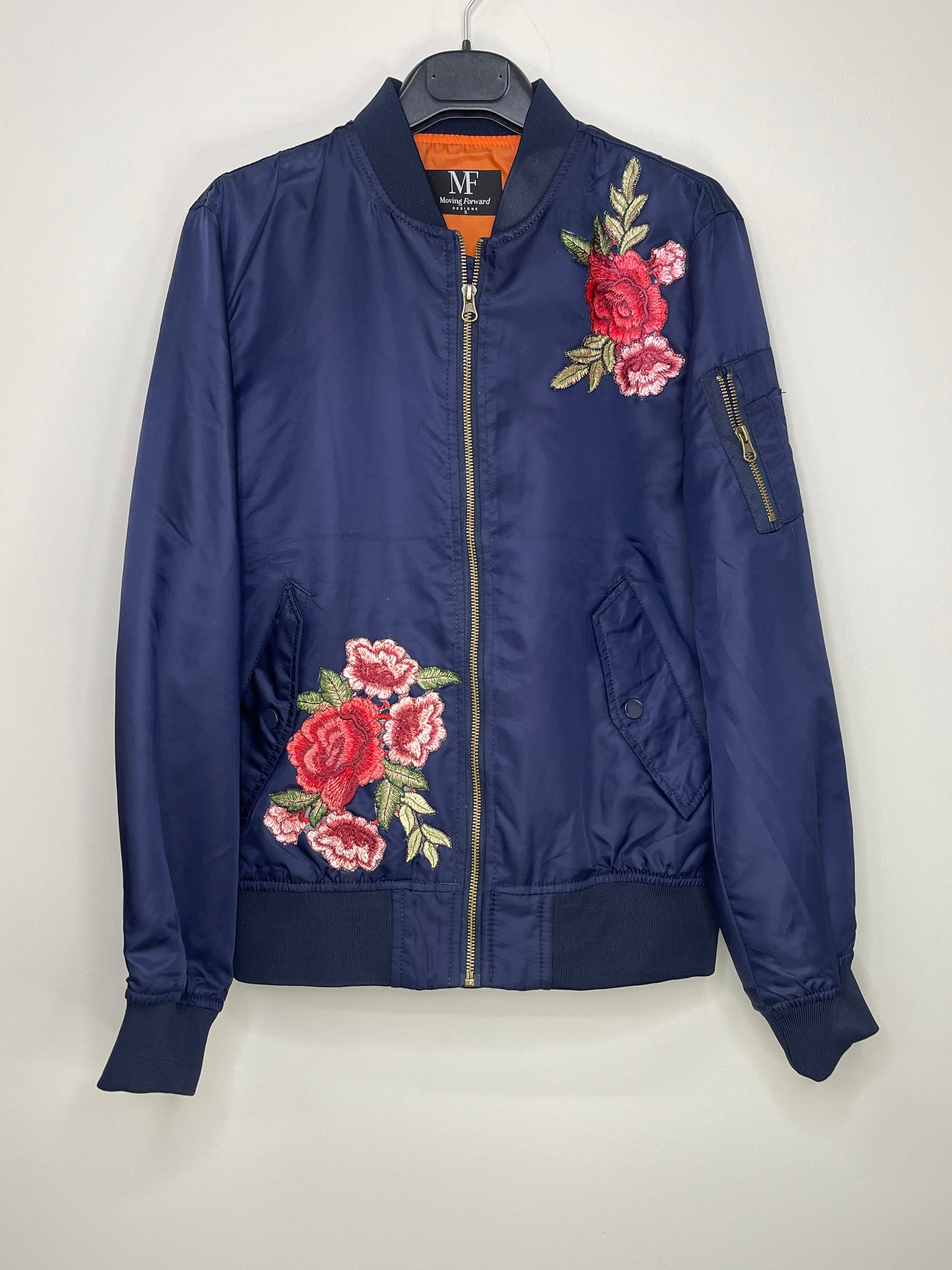 Introducing our bomber jacket in navy with embroidered floral designs. Sure to be a unique addition to any wardrobe and made with high-quality materials, it is both stylish and functional. Take on any adventure with confidence and stand out from the crowd in our latest style.