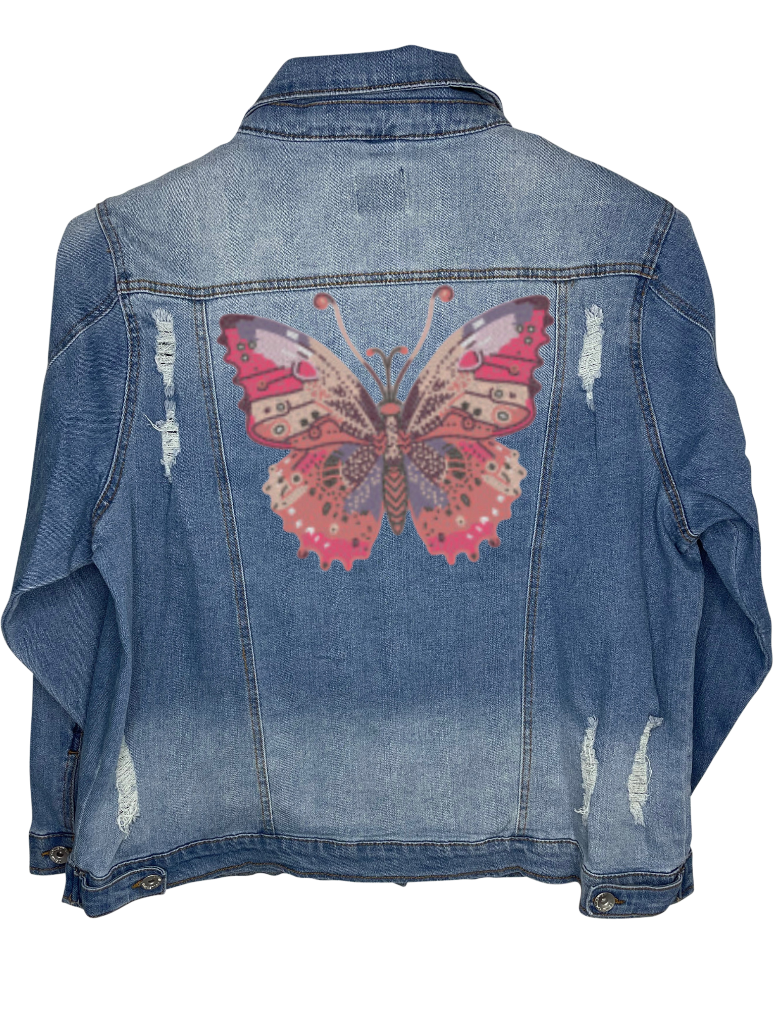 Complete your look in our denim jacket with crystal butterfly design. Crafted from a lightly distressed and stretchy medium wash denim, this jacket is perfect for any occasion. Add a touch of fun to any outfit!