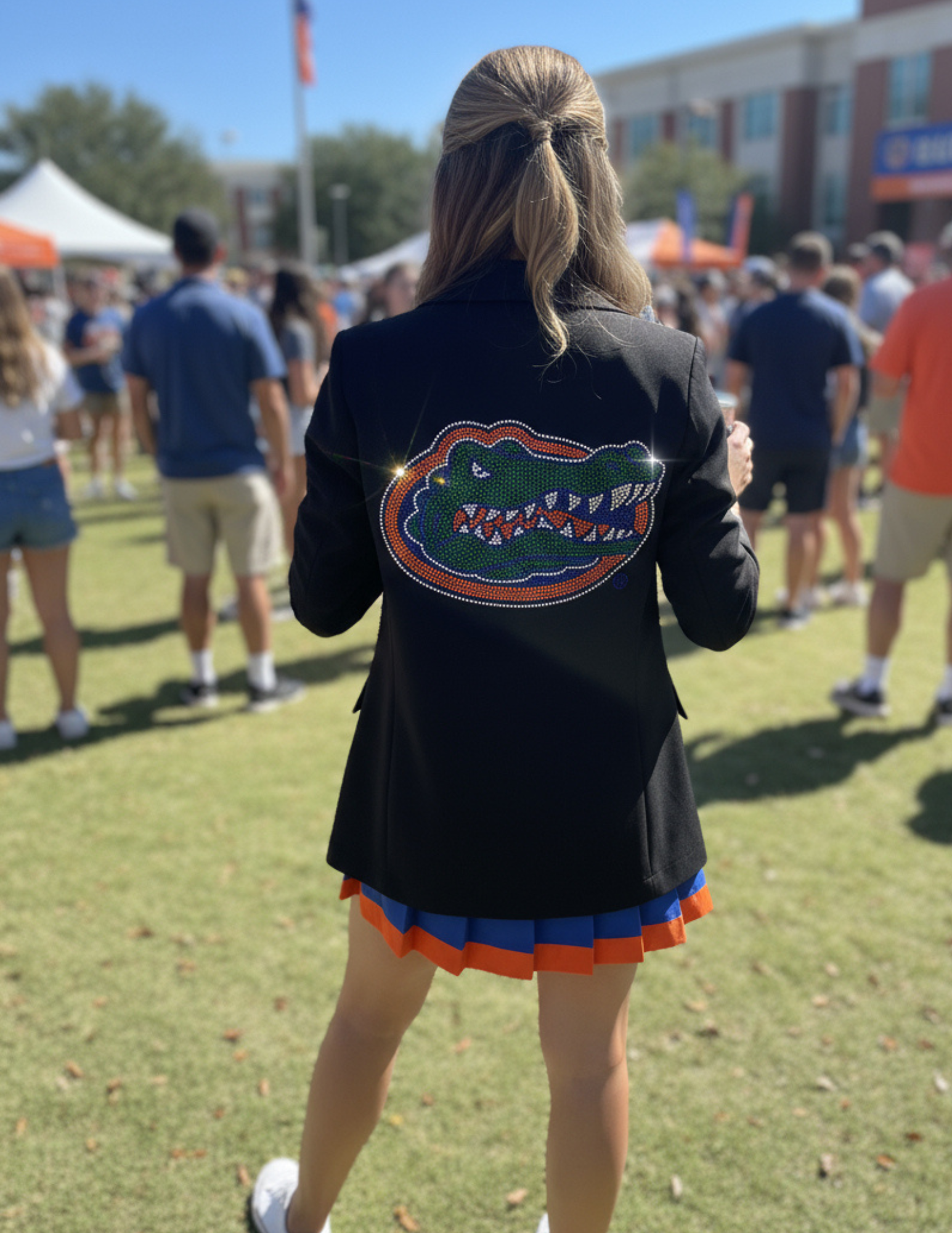 Show your University of Florida Gators pride with this Licensed Game Day Blazer in black ruched fabric. Featuring a stunning rhinestone gator head emblem, this blazer combines elegance with spirited fandom. Perfect for game days or special events, it adds a polished touch to your outfit while showcasing your team loyalty with expert craftsmanship and eye-catching sparkle.