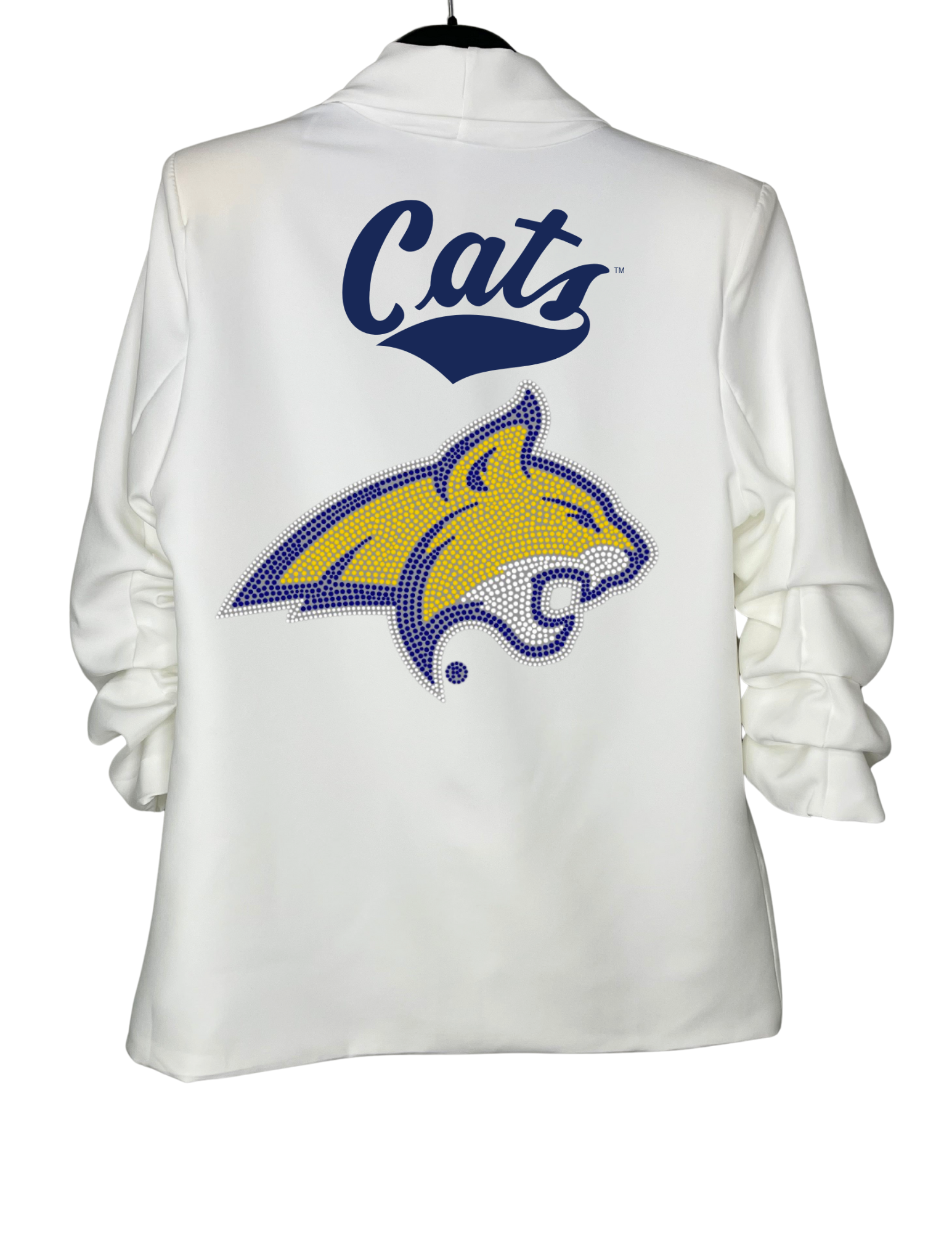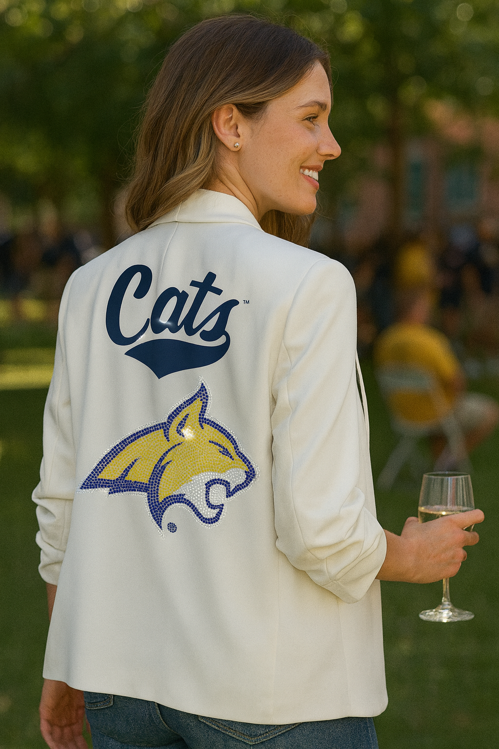 Show your Montana State pride with the Licensed Game Day Blazer in white, featuring the mascot beautifully crafted in sparkling rhinestones. This expert design combines collegiate spirit with elegant detailing, making it the perfect choice for fans who want to stand out with a refined, game-ready look.