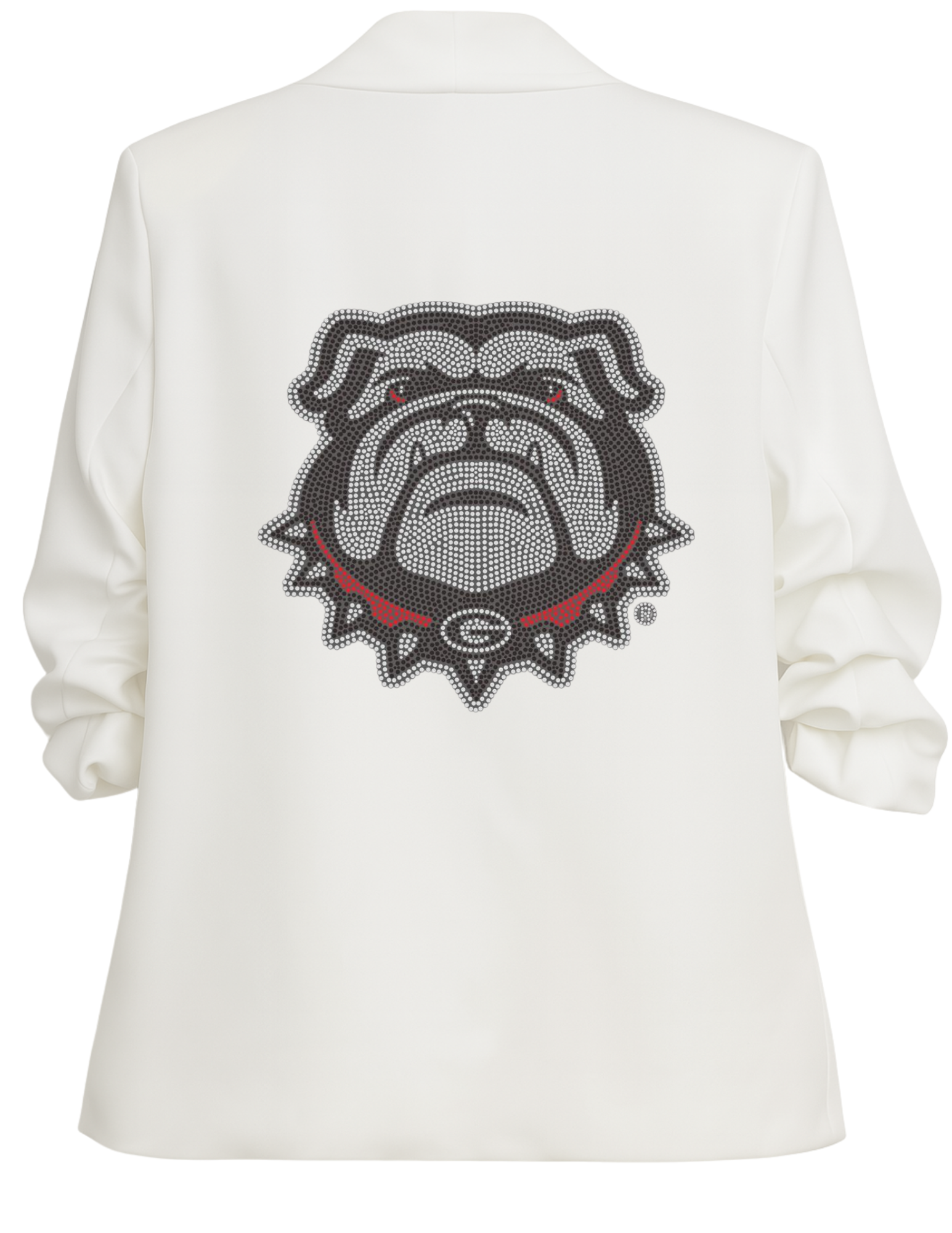 Elevate your game day style with this University of Georgia Bulldog blazer. Crafted in crisp white with elegant ruching detail, this tailored piece features a striking rhinestone logo that captures school spirit with sophistication. Perfect for tailgates, alumni events, or casual wear, the structured fit flatters while the premium construction ensures lasting durability. Show your Dawg pride with confidence in a blazer that transitions seamlessly from stadium to social gatherings. An essential addition to any Georgia fan's wardrobe.