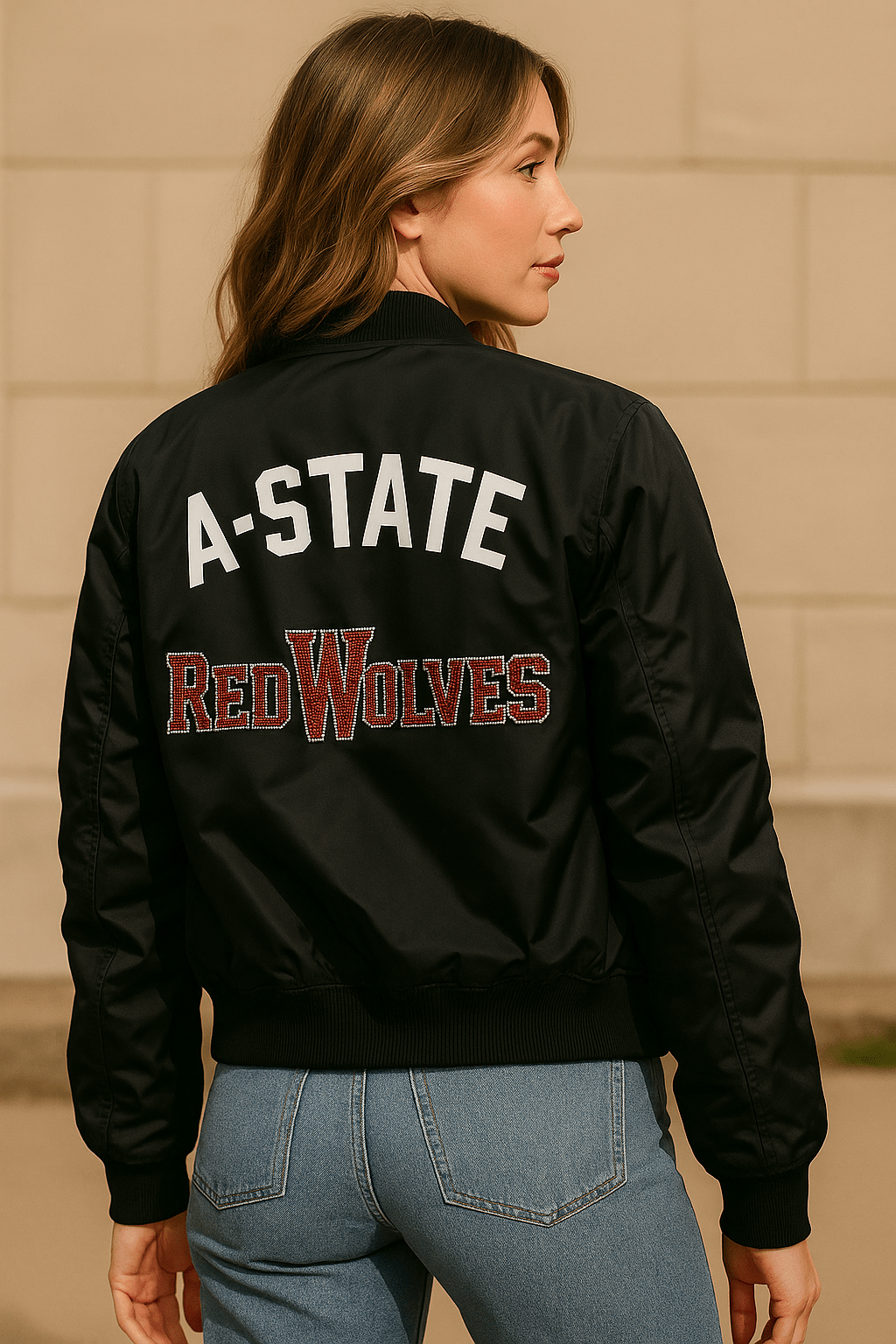 Showcase your Arkansas State pride with our officially Licensed Game Day Bomber Jacket in sleek black. This premium outerwear features authentic A-State Red Wolves branding, combining team spirit with contemporary street style. Crafted with quality materials for durability and comfort, this versatile bomber is perfect for game days, campus events, or casual wear. The distinctive design celebrates your Red Wolves loyalty while offering practical warmth and timeless appeal for any Arkansas State fan's wardrobe.