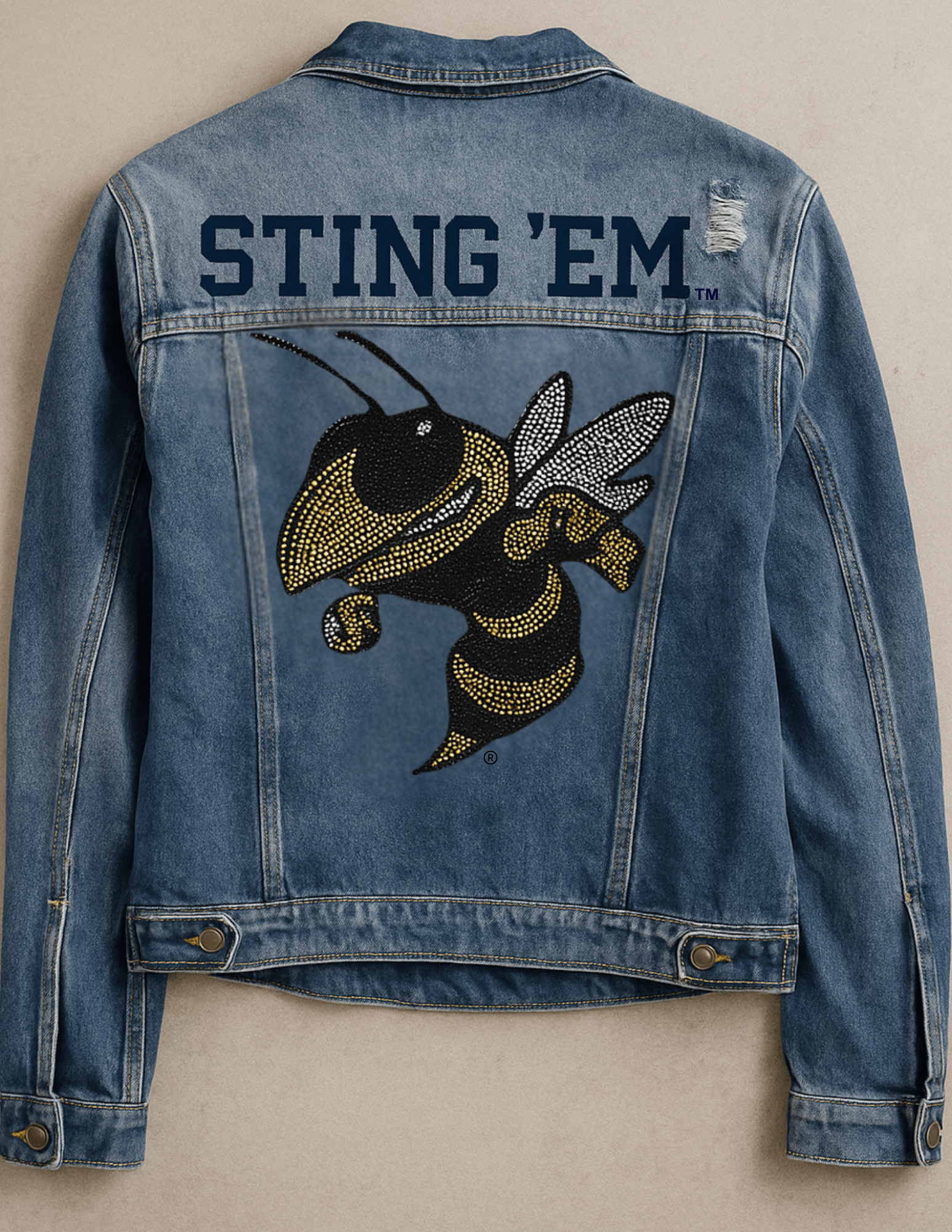 Show your Yellow Jacket pride in bold, crystal-clear style with our Georgia Tech “Sting ’Em” Rhinestone Denim Jacket. This officially licensed women’s jacket features a dazzling rhinestone Georgia Tech mascot on the back and “STING ’EM” text across the shoulders, making it the ultimate statement piece for game day or campus events. Designed with distressed denim for a vintage-luxe feel, this jacket blends comfort, edge, and school spirit. Pair it with boots or sneakers for the perfect sporty-chic look.