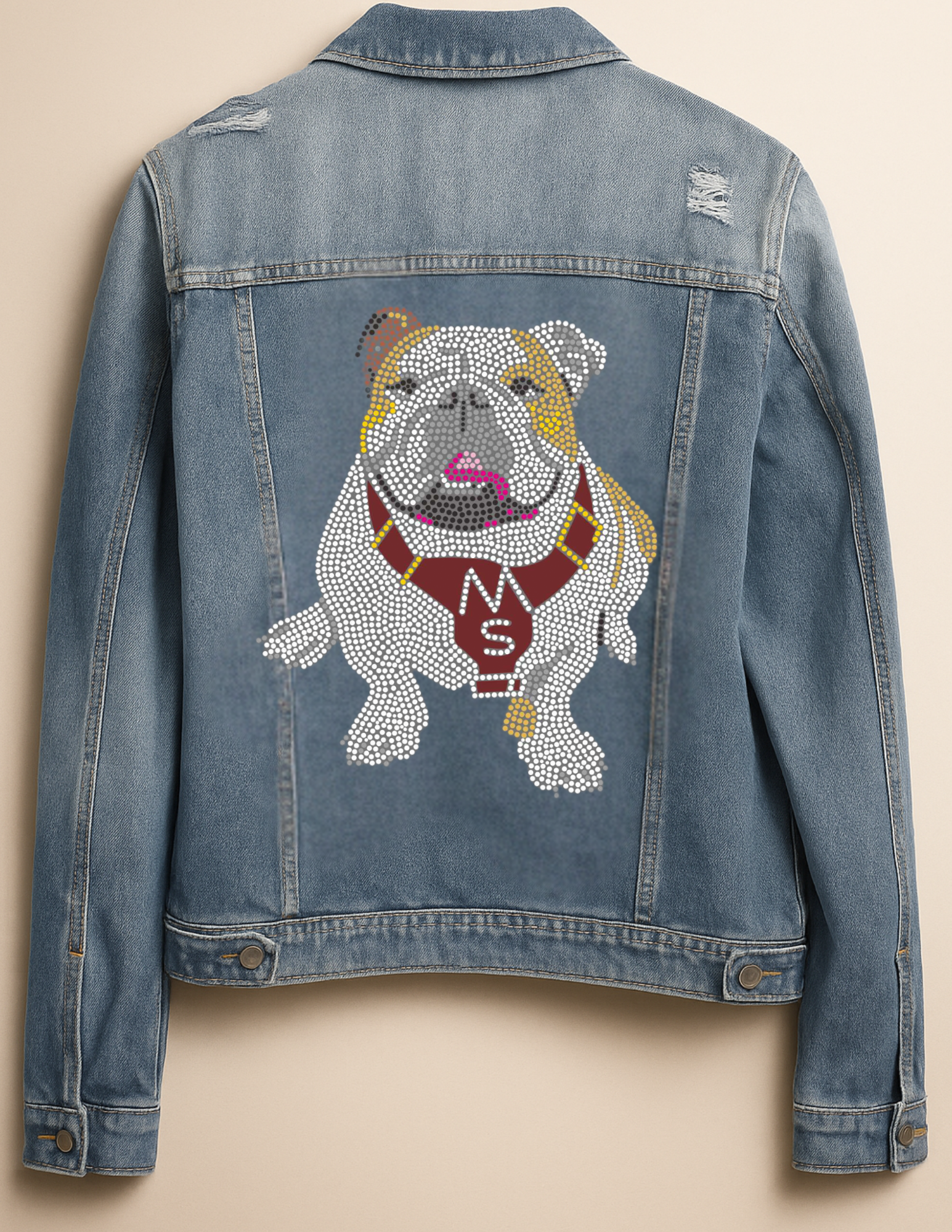 Elevate your Mississippi State pride with our premium Licensed Game Day Jacket in classic blue denim. This expertly crafted outerwear features a stunning full bulldog design enhanced with eye-catching rhinestone embellishments. Perfect for game days, alumni events, or showcasing your team spirit around campus. Combines collegiate authenticity with fashion-forward detailing for the dedicated Bulldogs fan.