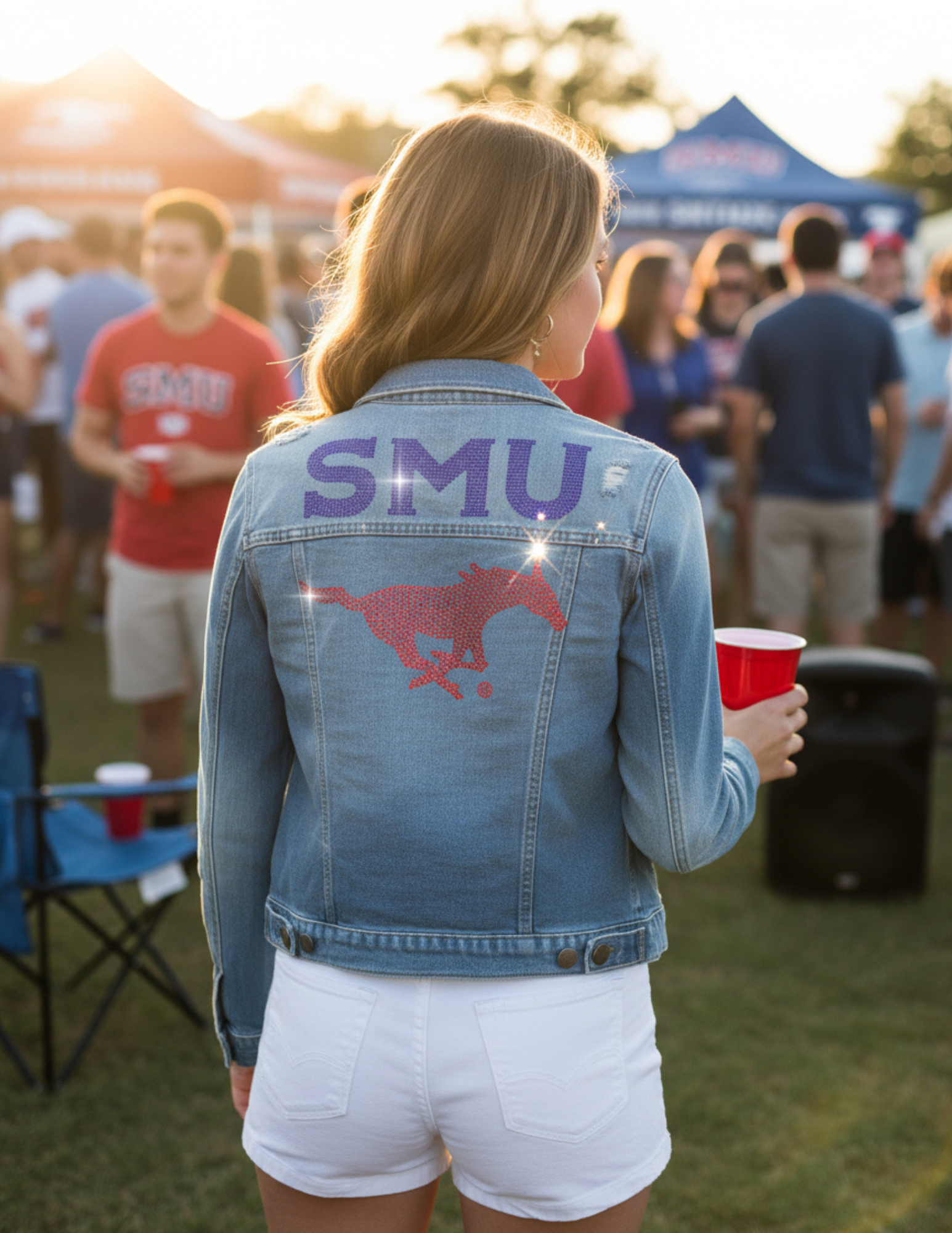 Show your SMU Mustang pride with this licensed Game Day Jacket in classic blue denim. Featuring a striking logo crafted entirely from rhinestones, this jacket offers a unique sparkle that stands out at every game. Durable denim construction ensures lasting wear, while the expert detailing highlights your team spirit with style and authenticity. Perfect for cheering on the Mustangs in comfort and confidence.