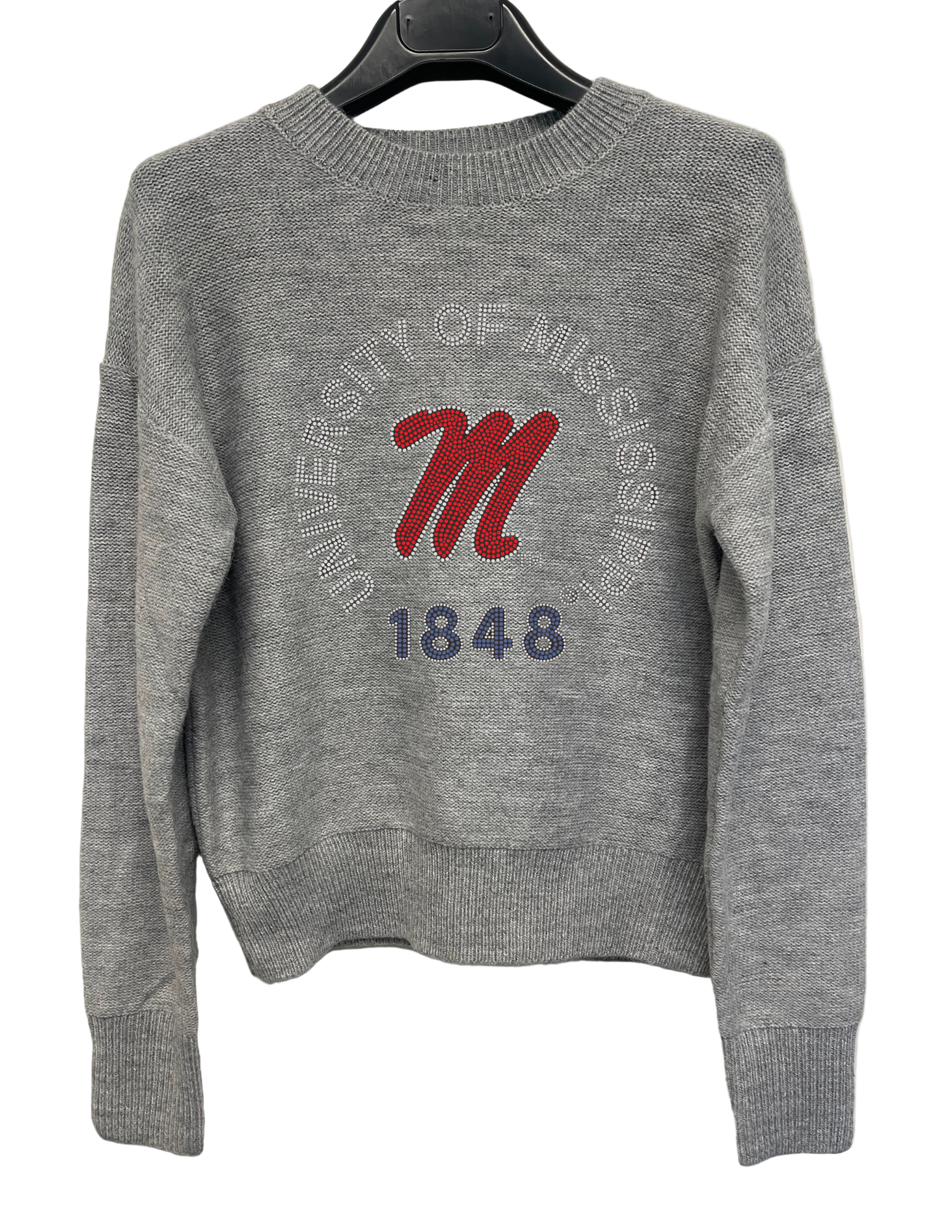 Show your team pride with the Licensed Game Day Sweater in gray, featuring a sparkling rhinestone logo that highlights Ole Miss Est 1848. Crafted for comfort and style, this sweater combines soft fabric with standout embellishments, making it perfect for cheering on game day or casual wear. Durable and eye-catching, it delivers lasting quality and a touch of collegiate spirit.