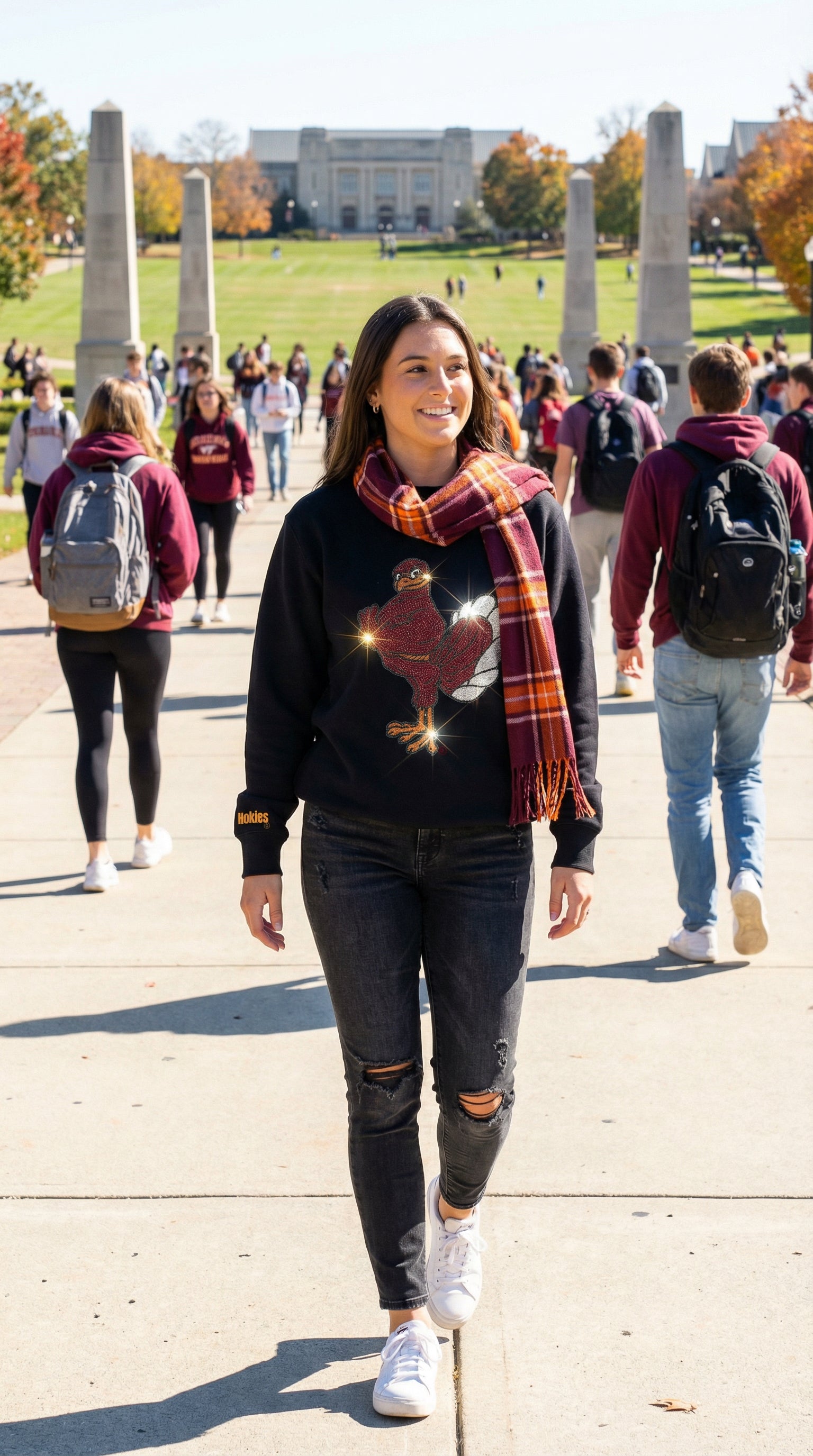 Show your Virginia Tech pride with this black crewneck sweatshirt featuring sparkling rhinestone details. Crafted for comfort and style, it offers a perfect blend of warmth and eye-catching design, ideal for game day or casual wear. Durable fabric ensures long-lasting wear while rhinestones add a subtle, sophisticated shine that stands out in the crowd.
