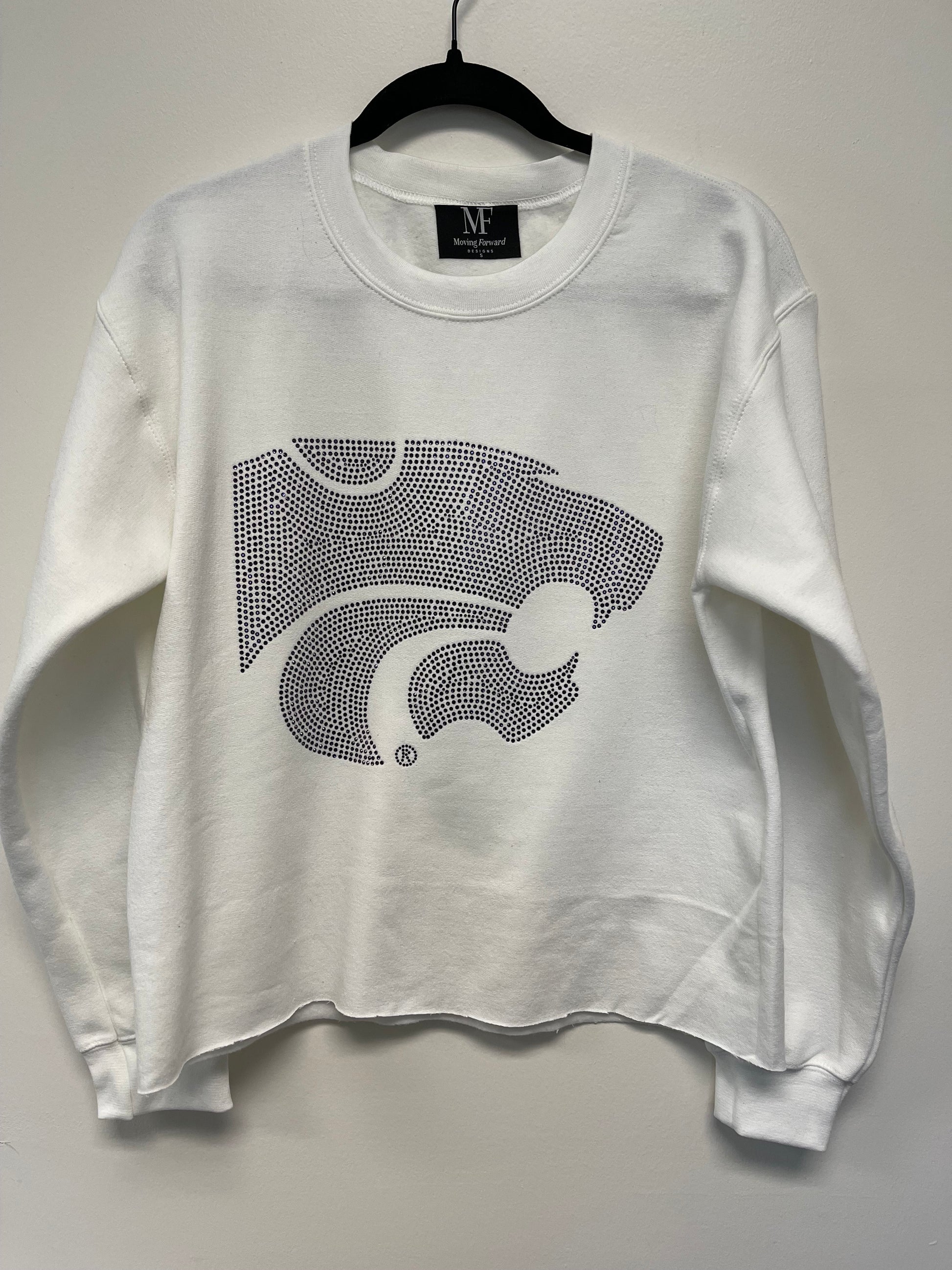 Kansas State Wildcat Head Game Day Sweatshirt in crisp white features a striking rhinestone logo that captures school spirit with sophisticated sparkle. This premium sweatshirt combines comfort with eye-catching design, perfect for game days, tailgates, or casual wear. The rhinestone embellishment adds dimension and durability, ensuring your Wildcat pride shines bright through every season. crafted for fans who demand quality and style.