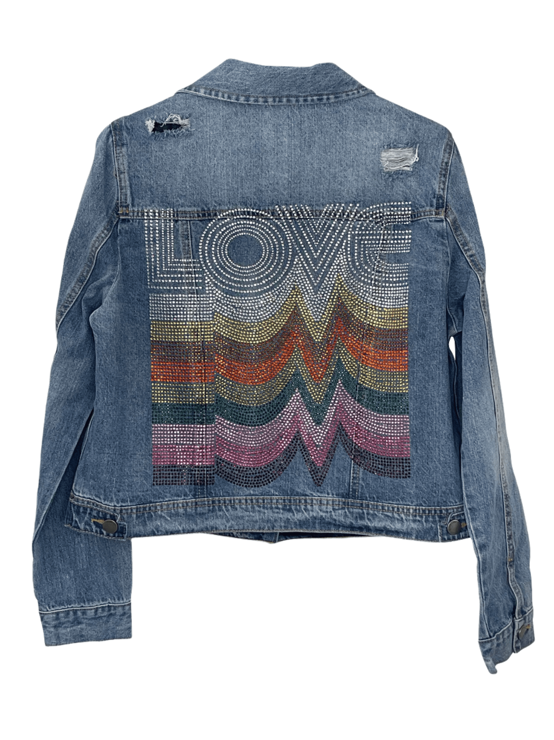 Make a statement in our medium-wash denim jacket, featuring a vibrant rhinestone butterfly design that dazzles on the back and sparkles subtly across the front. With its flattering fit and colorful embellishments, this jacket blends everyday ease with standout style. Perfect for layering and built to turn heads, it’s a must-have for those who love bold fashion with a touch of whimsy.