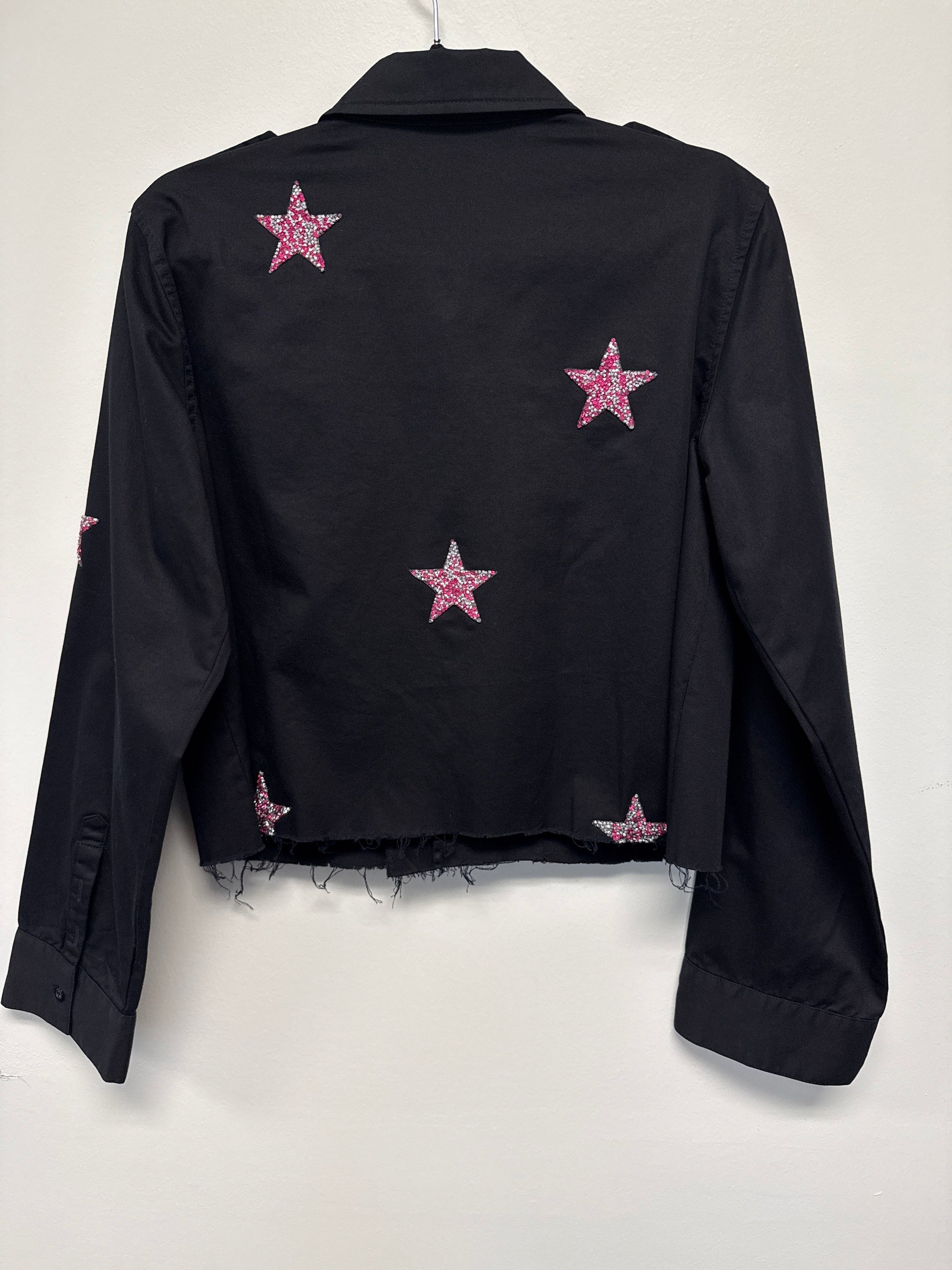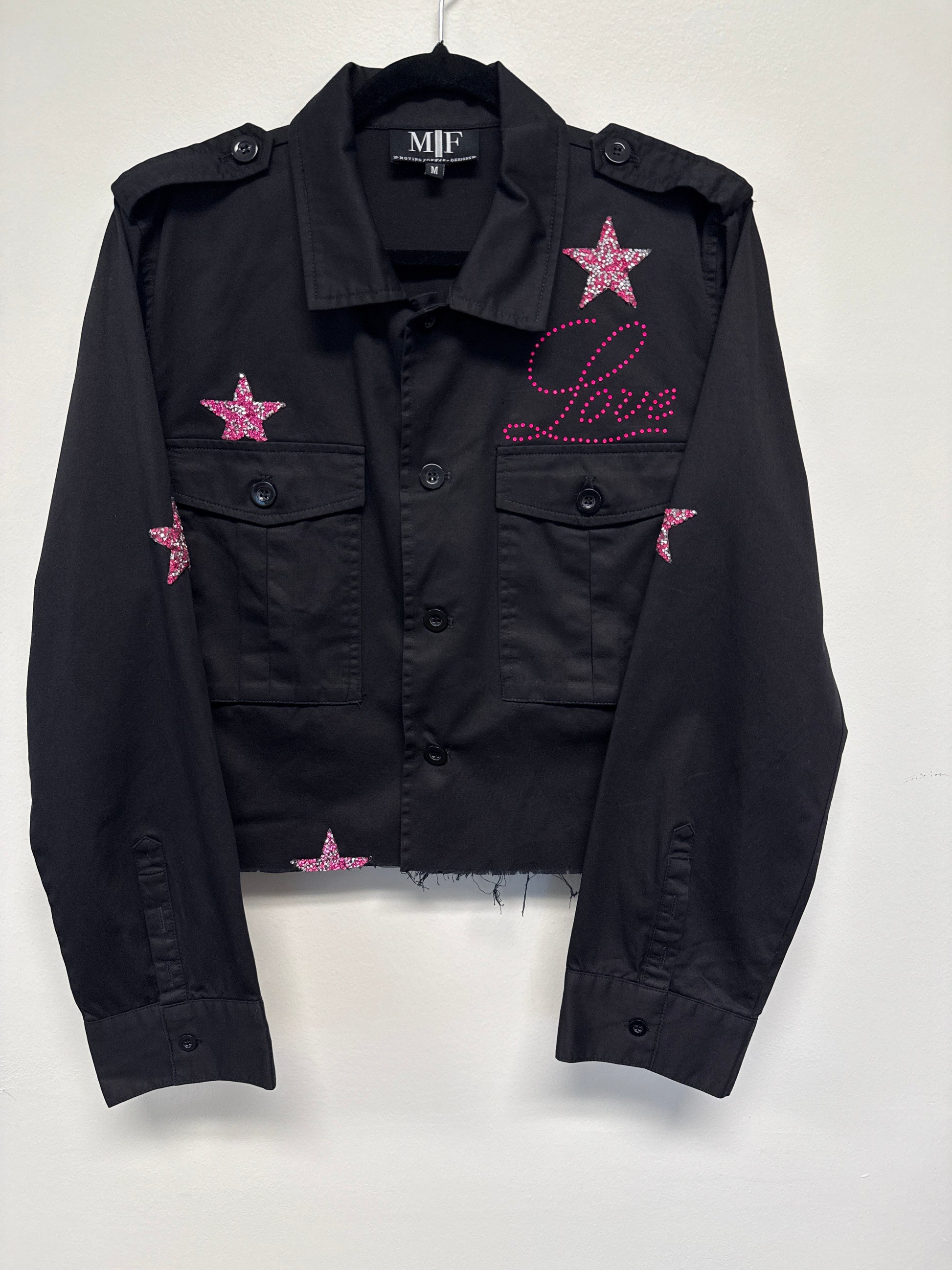 This classic army-style shacket with crystal pink star and Love details has a versatile fit that can be worn open or buttoned. Crafted from durable cotton fabric, this unique piece makes a smart statement. Bring a cool, urban look to your wardrobe today!