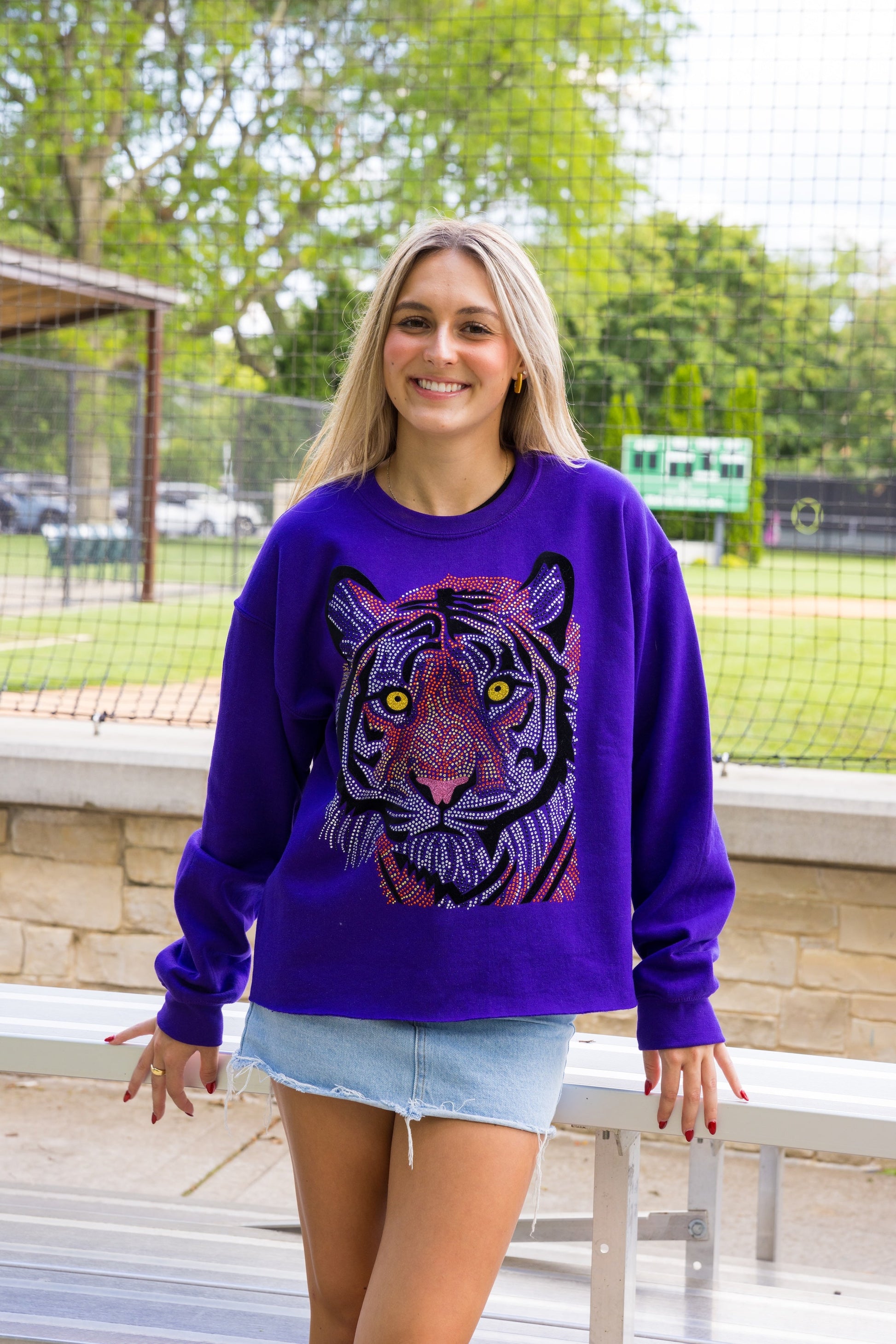 Elevate your casual wardrobe with this purple crewneck sweatshirt featuring a dazzling rhinestone tiger face design. Crafted for comfort and style, it adds a bold, eye-catching element to your outfit while ensuring cozy warmth. Perfect for standout streetwear or layering, this sweatshirt combines artistic detail with premium softness.