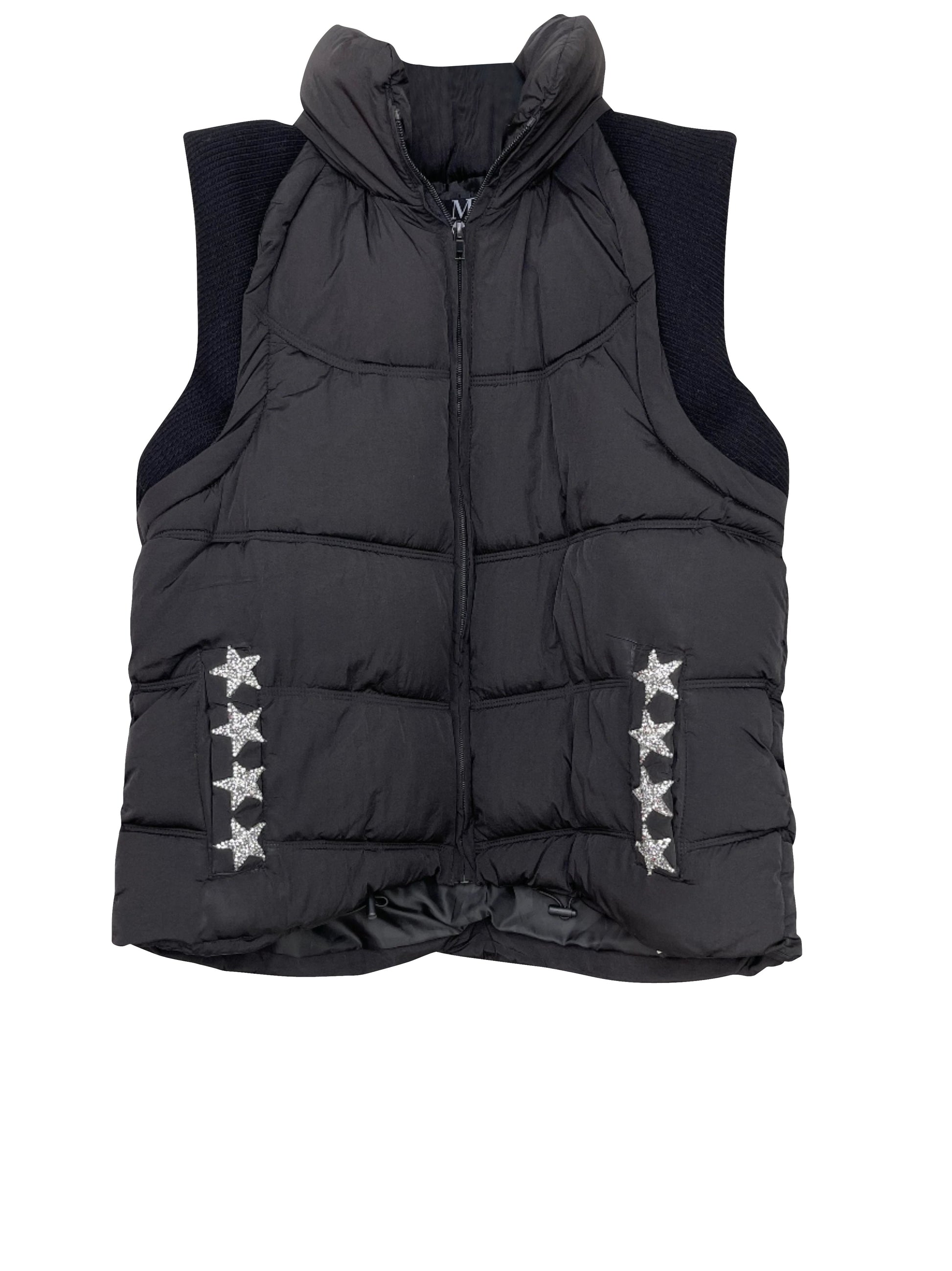 This stylish black puffer vest features a ribbed knit at the arms, an optional hood, and is embellished with silver crystal stars. Providing both warmth and style, it is ideal for all your outdoor activities. Made with top-notch materials, this vest guarantees comfort and durability. Elevate your wardrobe with this fashionable and practical piece.