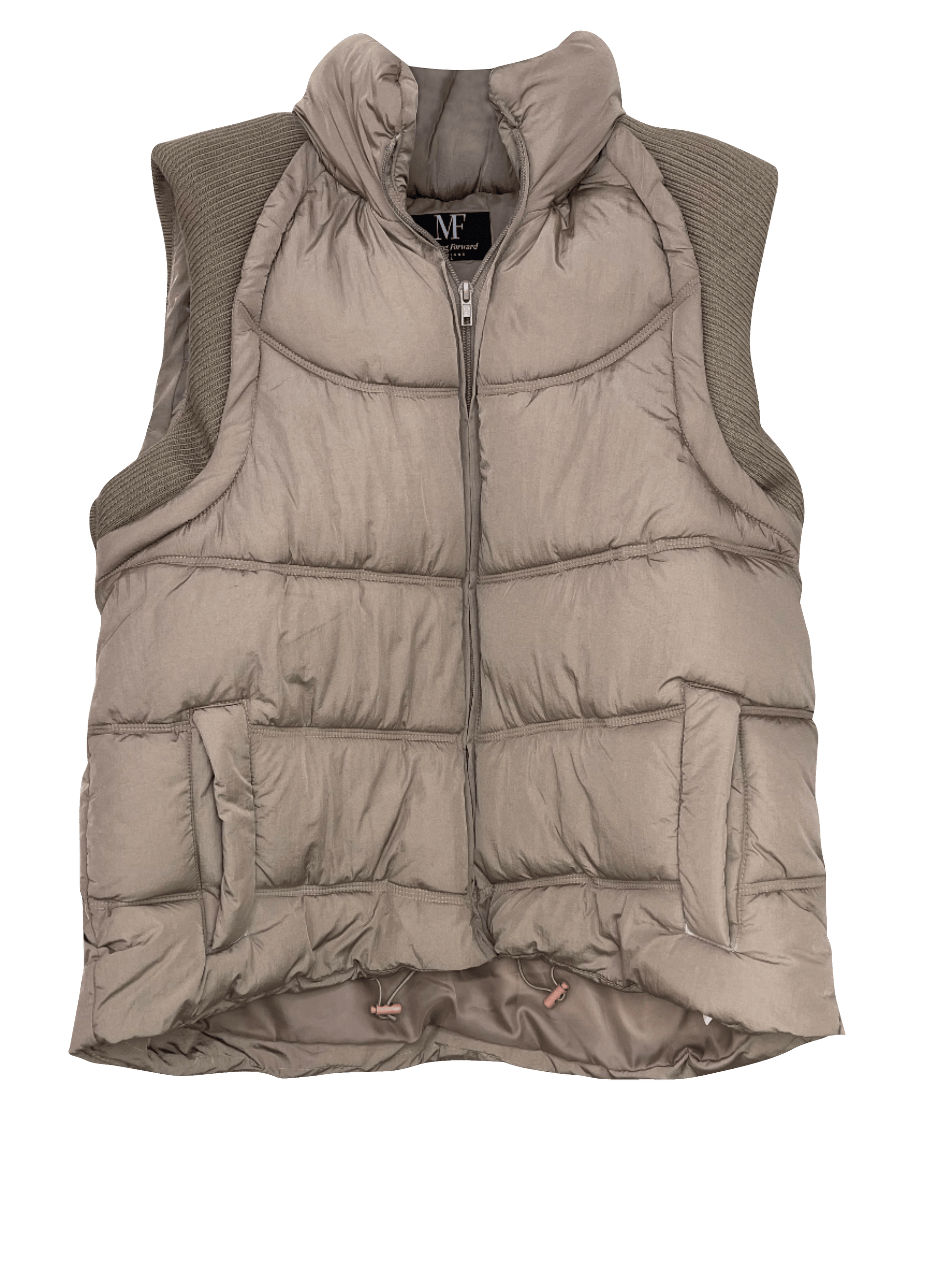 This stylish tan puffer vest features a ribbed knit at the arms, an optional hood, and is embellished with silver crystal stars. Providing both warmth and style, it is ideal for all your outdoor activities. Made with top-notch materials, this vest guarantees comfort and durability. Elevate your wardrobe with this fashionable and practical piece.